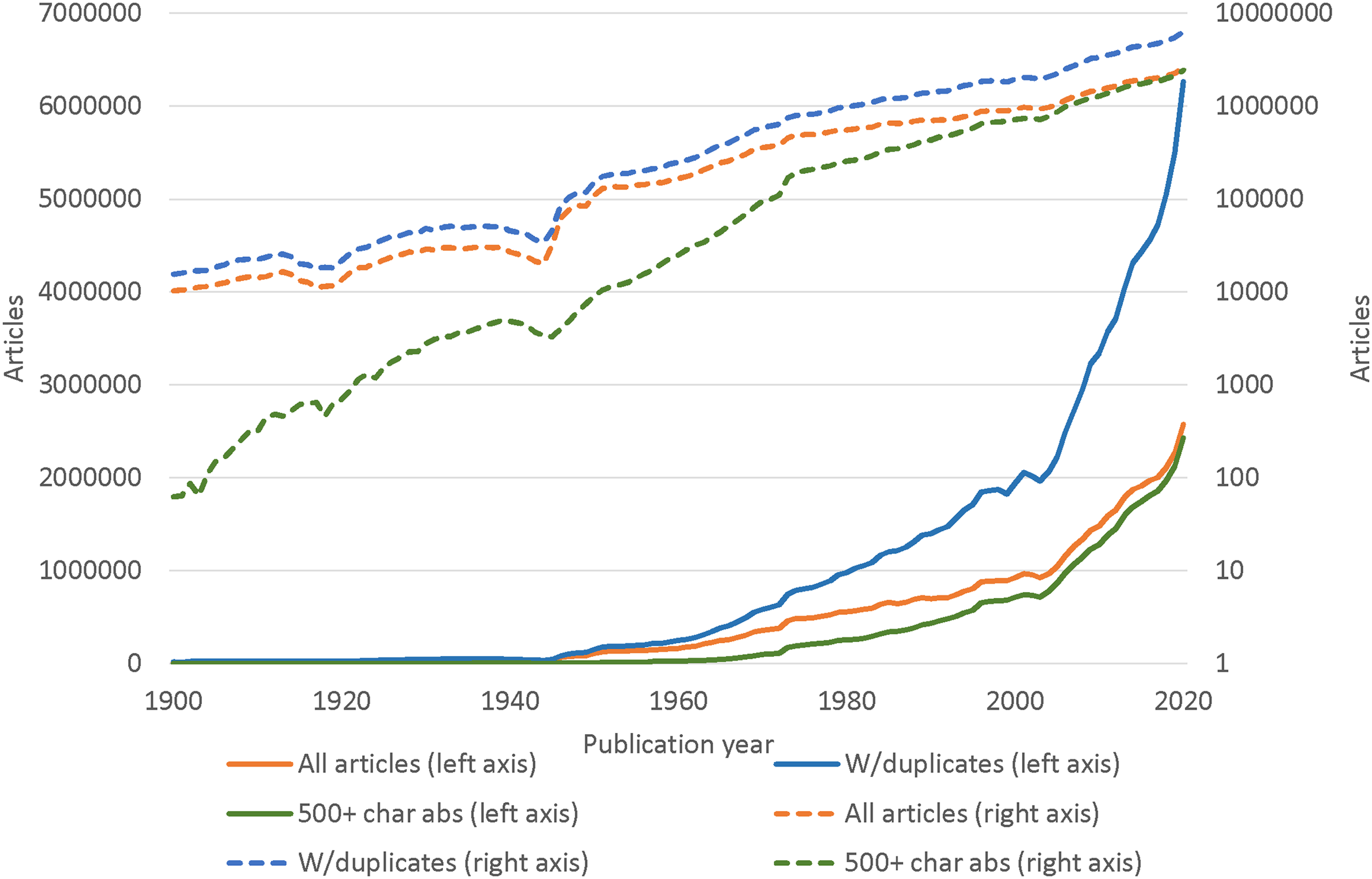 این مقاله تغییرات در گستردگی پوشش پایگاه استنادی اسکوپوس را طی ۱۲۱ سال از ۱۹۰۰ بررسی میکند. نتایج نشاندهنده رشد نمایی پایدار از سال ۱۹۰۰ است، بهجز کاهشهایی در طول دو جنگ جهانی، با افزایش رشد پس از ۲۰۰۴. در این دوره، درصد مقالات با چکیدههای بیش از ۵۰۰ کاراکتر از ۱٪ به ۹۵٪ افزایش یافت. در حالی که تعداد مقالات در هر مجله تا ۱۹۸۰ تقریباً ثابت بود و سپس به دلیل مجلات بزرگ و انتشار صرفاً آنلاین سه برابر شد. گستردگی اسکوپوس از نظر تعداد رشتههای تخصصی با مقالات قابلتوجه، از یک رشته با ۱۰۰۰ مقاله در ۱۹۴۵ به ۳۰۸ رشته در ۲۰۲۰ افزایش یافت. ویژگی بینالمللی اسکوپوس نیز بهطور چشمگیری تغییر کرد، بهطوری که سهم نویسندگان اول از آلمان و ایالات متحده از ۶۸٪ در ۱۹۰۰ به ۱۷٪ در ۲۰۲۰ کاهش یافت و چین با ۲۵٪ پیشتاز شد.